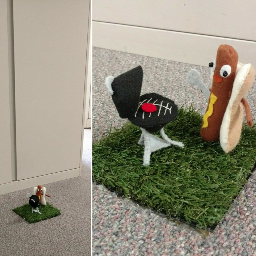 The first couple weeks of Wonky Felt were a bit haphazard and random. I had not yet developed the idea of doing a weekly theme. Each scene was a quick, overnight idea, with no real storyline. Because the floor hole itself was still relatively new, no one was certain whether it would be repaired in the near future.