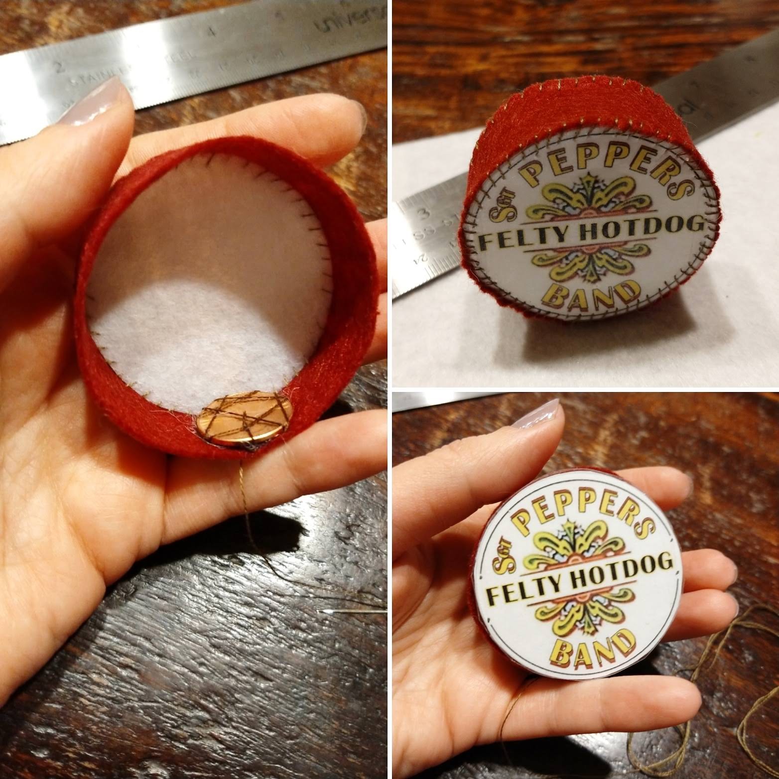 A great example of this is the drum I made for Beatles week. It was a basic cylinder, but it needed a little something extra to keep it from rolling around. Enter: The Hidden Penny Alert! I stitched a penny to the bottom of the inside of the drum, added my usual poly-fil, stitched up the back and like magic, the drum stands upright! And now, the song Penny Lane will forever have new meaning.